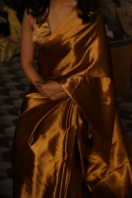 Sunhari Golden Satin Saree (With Stitched Blouse)